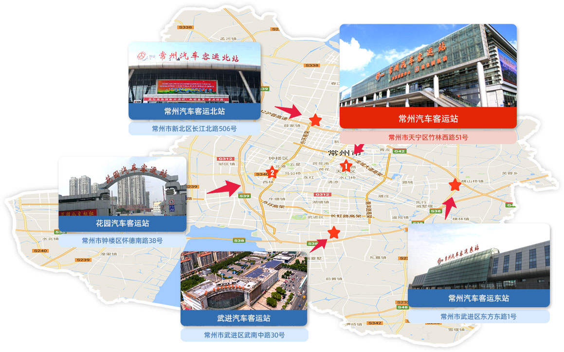 常州汽車客運站于2010年建成,地處常州北大門,是集高鐵、地鐵、公交為一體的綜合樞紐客運站。車站擁有11000平方米的候車、售票廳和32600平方米停車場,內(nèi)設(shè)售票窗口5個,檢票窗口30個,是常州地區(qū)最大的公路客運站。